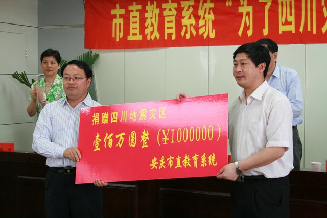 方祖中副市長指出,市教育系統(tǒng)在捐款活動中,行動快,效率高,成果大,在很短的時間內(nèi),就募集486余萬元,充分了表現(xiàn)全市廣大師生對祖國的熱愛,對災(zāi)區(qū)人民的深情。他代表市政府、市紅十字會和災(zāi)區(qū)人民對全市廣大師生表示最衷心的感謝。他強調(diào),安慶是教育強市、教育大市,要利用我市豐富的教育資源,對災(zāi)區(qū)學(xué)校開展幫扶活動,幫助災(zāi)區(qū)師生早日重建美好校園。