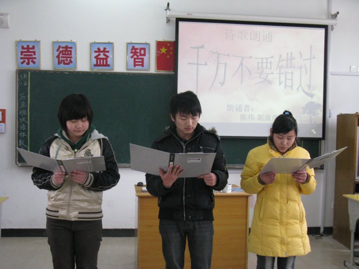 在班會的第三個環(huán)節(jié)中:三位同學(xué)朗誦了一首題為《千萬不要錯過》的詩歌,青春的聲音在教室里久久回蕩。