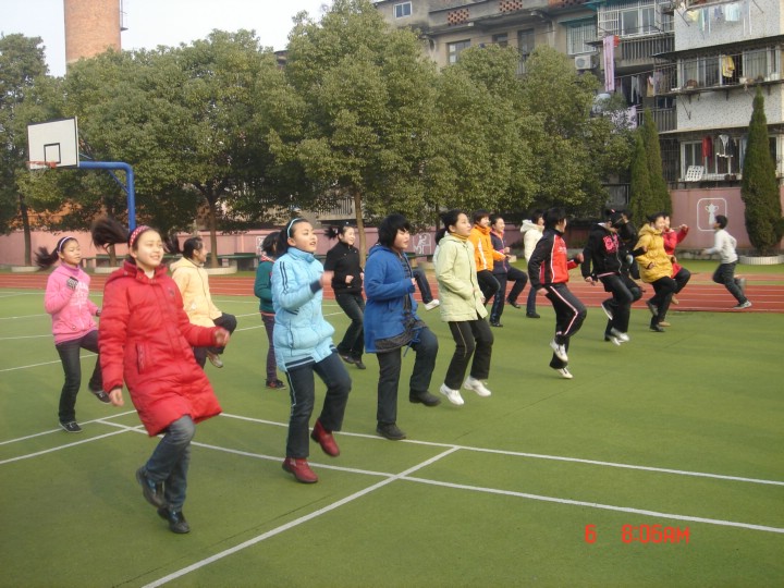 場地小、學生多,這是我校開展陽光體育運動面臨的最大困難,我們用“分時段、多形式”的方法克服了這一難題,最大限度地使更多的學生每天都堅持體育鍛煉。早操后到第一堂課預備前這段時間是晨練的高峰期,有許多班級在班主任的組織下,進行著各種形式的鍛煉,操場上一片沸騰。初二年級同學有序地繞著跑道練習長跑,初一年級的同學便在操場中間跳繩、立定跳遠或者原地高抬腿。下午放學后,是運動的黃金時期,這是特意留給初三的同學的,此時,當他們在跑道上揮灑汗水時,初一初二的同學正在乒乓球臺、籃球場、前操場進行著豐富多彩的課外體育活動呢!