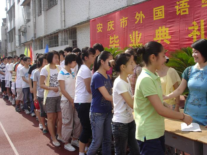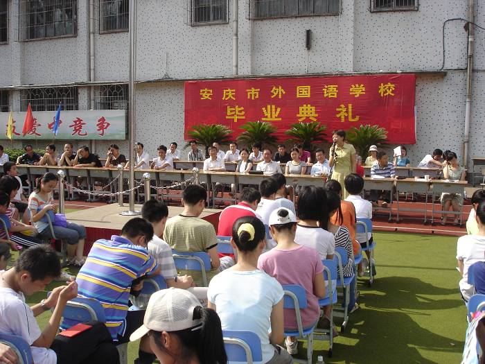 六月二十七號早上八點整,安慶市外國語學(xué)校2009屆初中畢業(yè)典禮在安外西區(qū)操場舉行。畢業(yè)典禮在國歌聲中開始,江楠老師擔(dān)任主持。分別在即,同學(xué)們充滿著激動和不舍,初三(1)班魏艾卉代表全體畢業(yè)班同學(xué)向母校表達心聲。李悅老師代表初三年級全體老師向順利完成學(xué)業(yè)的同學(xué)表示熱烈的祝賀和衷心的祝福。各班學(xué)生代表和班主任分別致辭,表達了自己的感情。校領(lǐng)導(dǎo)為同學(xué)們頒發(fā)畢業(yè)證書,黃文莉校長向所有的畢業(yè)生送上祝福,祝愿所有的同學(xué)前程燦爛輝煌。