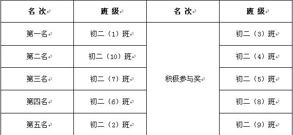 為豐富學(xué)生的課余文化生活,加強(qiáng)班級(jí)間的交流與學(xué)習(xí),培養(yǎng)學(xué)生的協(xié)作精神和團(tuán)隊(duì)意識(shí),德育部、初二年級(jí)組特舉行了學(xué)生拔河比賽,經(jīng)過緊張而又激烈的預(yù)賽、決賽,最終,初二(1)班力拔頭籌,其余各班分獲等級(jí)獎(jiǎng)、參與獎(jiǎng)。本次比賽的具體結(jié)果如下: