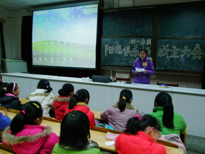 12月28日下午第四節(jié)課,我校陽(yáng)光俱樂(lè)部在報(bào)告廳舉辦了初一分社成立大會(huì)。會(huì)議由上屆俱樂(lè)部副社長(zhǎng)吳夢(mèng)玥主持,首先宣讀了新入社會(huì)員名單,并且給競(jìng)選上的12名理事會(huì)成員頒發(fā)了“陽(yáng)光使者證”。緊接著,由卓亞妮同學(xué)代表老會(huì)員向新會(huì)員致歡迎詞。