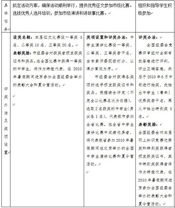 方式:初一、二、三年級各班推薦一名參賽選手進(jìn)行寫稿,均由本班班主任推薦、語文老師指導(dǎo),2010年4月8日交稿(交至德育部,過期稿件,不予參加比賽)。由學(xué)校德育部、語文組評出2篇優(yōu)秀文章(其余均被評為校級獎)報(bào)送至市組委會辦公室。市組委會將邀請有關(guān)專家對參賽征文進(jìn)行評審,評出一、二、三等獎,同時對優(yōu)秀征文各選送5篇參加全省比賽,省組委會將選送全省中學(xué)生優(yōu)秀征文參加全國比賽。全市部分優(yōu)秀征文將在《青少年文匯》上發(fā)表。