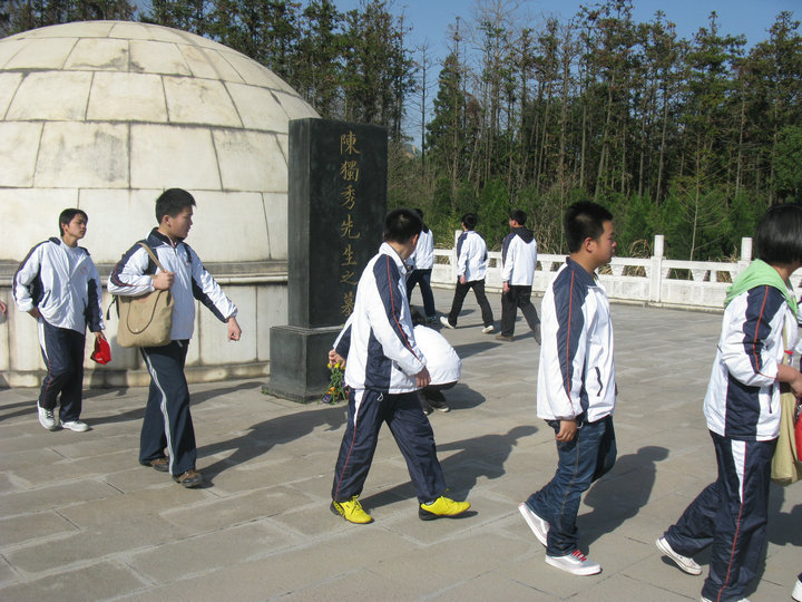 清明時節(jié),我校學(xué)生帶著無比崇敬的心情進入獨秀陵園。進入陵園滿目的綠蔭也顯得肅穆。同學(xué)們邁著沉重的腳步,懷著崇敬的心情緩步來到先生墓前,為了寄托對先生的哀思。學(xué)生代表向先生墓碑敬獻花圈。在莊嚴(yán)肅穆的碑前,學(xué)生們集體默哀3分鐘,緬懷為中華民族解放、國家富強和人民幸福生活而做出奮斗的先生。在先生的墓前,學(xué)生認(rèn)真聆聽老師對先生生平的介紹,在心中蕩漾起無盡的思緒。在獻完花后,學(xué)生們都沉浸了懷念先生的悲思中?!耙痪瞎?心情沉重,“再鞠躬” 思緒萬千,“三鞠躬”心潮彭湃、熱血沸騰……