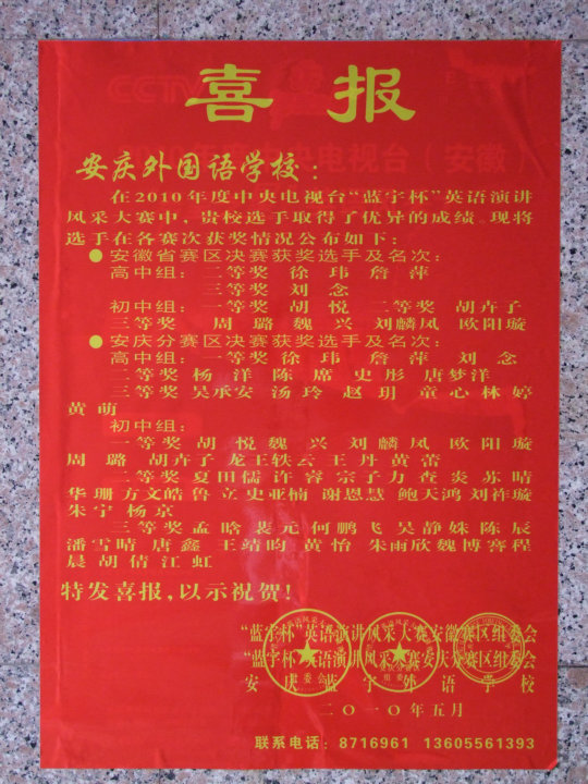 熱烈祝賀我校52名選手在2010年度中國中央電視臺(tái)“藍(lán)宇杯”英語演講風(fēng)采大賽中取得優(yōu)異成績(jī)。