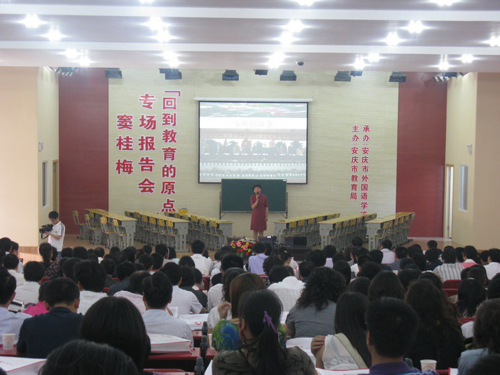 6月6日上午,陽光燦爛,微風(fēng)習(xí)習(xí),在安慶市外國(guó)語學(xué)校嶄新的報(bào)告廳里,市教育局吳功華副局長(zhǎng)、張復(fù)雙書記和來自全市的五百多位中小學(xué)校長(zhǎng)、班主任濟(jì)濟(jì)一堂,共同觀摩了全國(guó)著名特級(jí)教師竇桂梅的語文課堂教學(xué),聆聽了竇桂梅老師的專題講座《回到教育的原點(diǎn)》。這次竇桂梅老師專場(chǎng)報(bào)告會(huì)由安慶市教育局主辦,安慶市外國(guó)語學(xué)校承辦,旨在進(jìn)一步推進(jìn)我市基礎(chǔ)教育教學(xué)改革,提升中小學(xué)班主任管理工作水平。