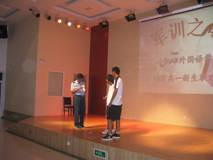 白天訓(xùn)練場(chǎng)上大家你追我趕,晚上報(bào)告廳一片歡聲笑語(yǔ)。一曲《朋友》拉開(kāi)了聯(lián)歡晚會(huì)的序幕,軍訓(xùn)讓同學(xué)們結(jié)下了兄弟姐妹情誼。今晚在此歡聚一堂,颯爽的風(fēng)姿,嘹亮的歌聲博得了大家熱烈的掌聲。教官們的精彩表演也讓同學(xué)們見(jiàn)識(shí)了軍訓(xùn)中最嚴(yán)肅的他們的可愛(ài)一面。最后一首集體大合唱《嚴(yán)明紀(jì)律歌》再一次響徹學(xué)校禮堂,為了明天屬于同學(xué)們自己的閱兵式,出發(fā)吧!
