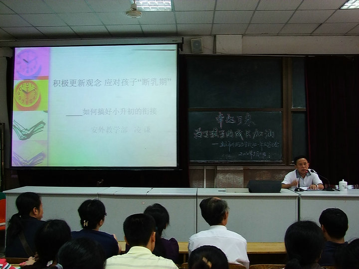 九月十一日上午,安慶市外國語學(xué)校召開了一年一度的初一年級新生家長會。本次家長會的主題是“牽起手來為了孩子的成長加油”。早晨八點半,隨著教學(xué)部凌主任的講話開始,家長會也正式拉開了帷幕。所有初一新生的家長都濟(jì)濟(jì)一堂,與教師親密接觸,共同探討如何在緊密家校聯(lián)系的前提下搞好學(xué)生的雙向(學(xué)校、家庭)教育。凌主任首先代表學(xué)校對于家長的到來表示了熱烈的歡迎,并對初一新生目前的學(xué)習(xí)狀況了進(jìn)行了大致的介紹。隨后,黃校長將學(xué)校的一些基本情況做了詳細(xì)的介紹,并就其中的管理制度及紀(jì)律規(guī)范做了著重強(qiáng)調(diào),她語重心長地告訴諸位家長“安外是在把教育當(dāng)作事業(yè)來做!”在要求家長積極配合學(xué)校教育的同時也要對學(xué)校放心,對老師放心,對孩子關(guān)心、讓孩子開心。只有家庭和學(xué)校密切配合、共同努力,孩子的成績才能有得力的保障。
