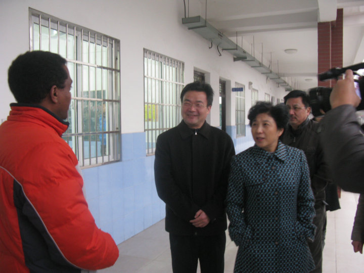肖市長(zhǎng)一行12人實(shí)地察看了學(xué)校教學(xué)樓、學(xué)生宿舍、食堂,深入老師和學(xué)生中間,問(wèn)寒問(wèn)暖,并與來(lái)自埃塞俄比亞的小學(xué)外教Eyasu進(jìn)行了親切的交談。