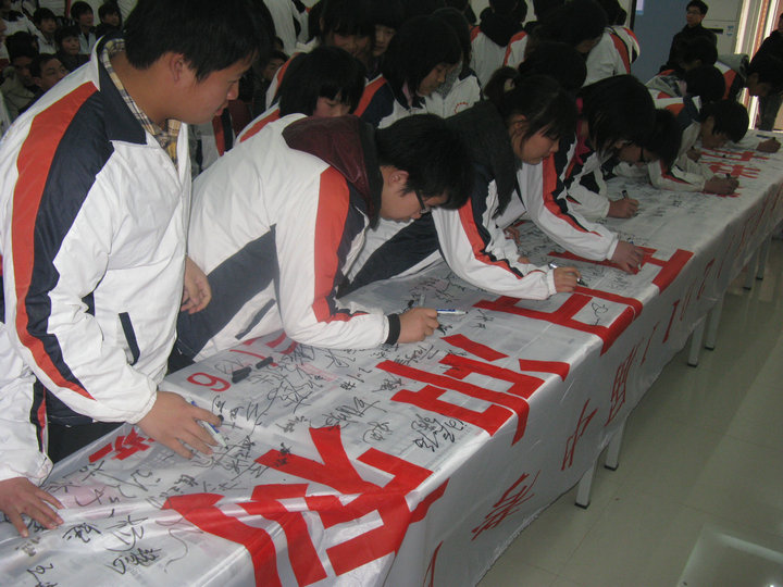 教師宣誓、學(xué)生宣誓把百日誓師大會(huì)推向了高潮。在莊嚴(yán)的宣誓中,師生表達(dá)了對(duì)百日沖刺的強(qiáng)烈愿望和必勝的信心!伴隨著《真心英雄》歌聲,全體學(xué)校領(lǐng)導(dǎo)、家長(zhǎng)代表、師生在寫有“團(tuán)結(jié)合作 奮力拼搏 百日沖刺 再創(chuàng)輝煌”條幅上誓師簽名。在爆竹聲中黃文莉校長(zhǎng)和程金柳校長(zhǎng)開啟了中考倒計(jì)時(shí)牌,并對(duì)學(xué)生進(jìn)行了鼓勁講話,學(xué)生的臉上都寫滿了笑容與自信!最后大會(huì)在激情飛揚(yáng)《相信自己》的歌聲中結(jié)束。