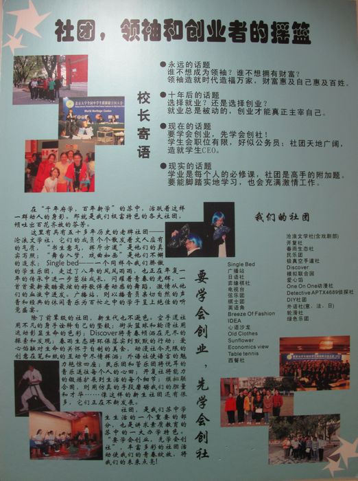 從校史館出來,我們參觀了蘇州中學的校園,并重點參觀了蘇州中學的社團營地。來到社團營地,我們首先被眼前琳瑯滿目的社團活動海報、社團招聘啟事等深深吸引,同時又被溫馨整潔而又充滿現(xiàn)代氣息的各種工作室深深震撼,我們一方面感嘆于蘇州中學對學生社團活動的高度重視和大力支持,另一方面感嘆于蘇州中學的學生們杰出的才華和參加社團活動的積極性。