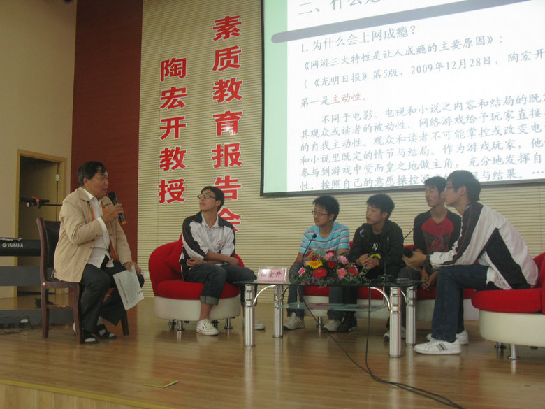 大會(huì)由安慶市外國(guó)語(yǔ)學(xué)校校長(zhǎng)黃文莉主持。在全場(chǎng)師生熱烈的掌聲中,有“中國(guó)戒除網(wǎng)癮第一人”之稱的陶宏開(kāi)教授登上了講臺(tái),以一首自創(chuàng)自彈自唱的勵(lì)志英文歌曲拉開(kāi)了演講的序幕。陶教授以風(fēng)趣幽默的語(yǔ)言闡述了什么是素質(zhì)教育,“素質(zhì)教育”就是通過(guò)引導(dǎo)學(xué)生全面提升“心理素質(zhì)、專業(yè)素質(zhì)、綜合素質(zhì)”,從而達(dá)到知且識(shí)的過(guò)程。通過(guò)進(jìn)行“素質(zhì)教育”,實(shí)現(xiàn)“道德重建”,最終使迷網(wǎng)青少年戒除網(wǎng)癮,健康上網(wǎng)。通過(guò)實(shí)行“素質(zhì)教育”,實(shí)現(xiàn)成人、成才、成功。陶教授除了以大量的事實(shí)和精辟的理論指引學(xué)生,還運(yùn)用多媒體播放自己拍攝創(chuàng)作演唱的MTV《愛(ài)》、《學(xué)費(fèi)》等貼近學(xué)生生活的歌曲感染鼓舞學(xué)生,以互動(dòng)討論的形式啟發(fā)學(xué)生思考理想、生命、事業(yè)、學(xué)習(xí)等問(wèn)題……整個(gè)會(huì)場(chǎng)高潮迭起,同學(xué)們也都積極踴躍的發(fā)言,氣氛熱烈,掌聲不斷。