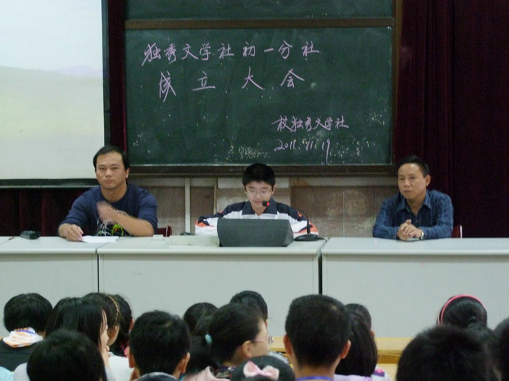 2011年10月19日早讀課,我校獨(dú)秀文學(xué)社在一樓報(bào)告廳舉行了初一年級分社成立大會(huì)。教學(xué)部凌謙主任、語文教研組長周興斌老師、初一語文備課組長計(jì)裕昆老師出席會(huì)議。會(huì)議由周興斌老師主持。