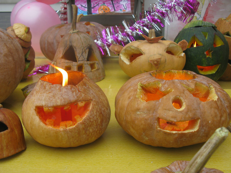 南瓜燈:萬圣夜的象徵物是南瓜燈及南瓜雕空制作的燈籠;南瓜是萬圣節(jié)的寵物。