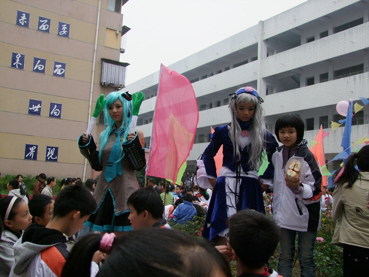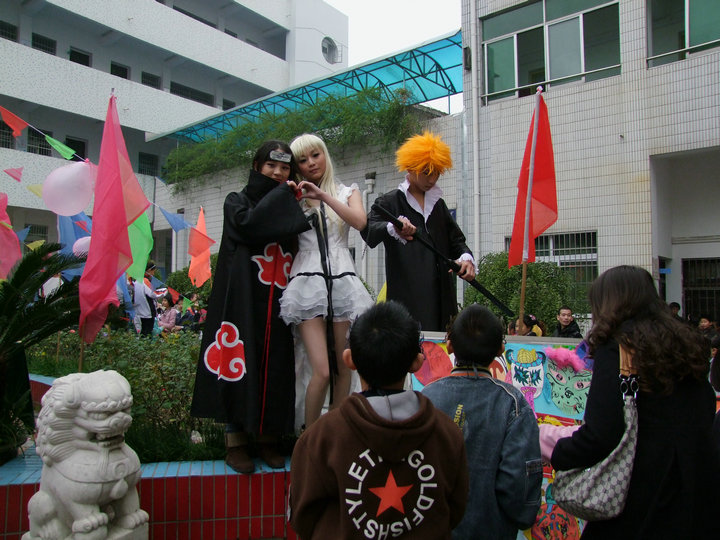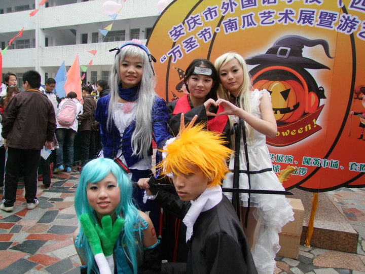 新學期初始,為迎合學生的興趣,豐富他們的課外生活,學校成立了AM動漫社。10月30日上午,安慶市外國語學校在全體師生們熱切的期待中,迎來了校第七屆“萬圣節(jié)·大型南瓜藝術(shù)展暨游藝活動”?;顒悠陂g,動漫社成員們?nèi)宋锇缪萘撕谄橐蛔o、小嘰、水銀燈、曉組織、初音等動漫人物。精致的妝容,華麗的服裝,一亮相就吸引了前來參觀游玩的小朋友們的圍觀。在瑟瑟秋風中,社員們頂著妝容,克服了身體上的勞累,堅持完成了此次展演。cosplay無疑成為此次萬圣節(jié)游藝活動中的一抹亮色。