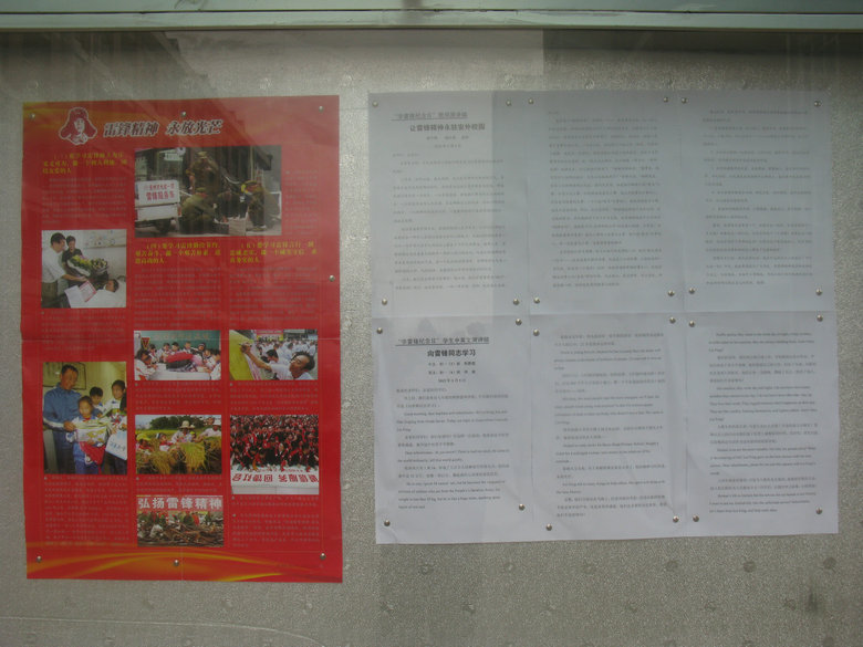 上午11點的時候,校園廣播里開始播放歌曲《學習雷鋒好榜樣》,讓全校師生再次感受雷鋒精神。在學校的宣傳欄里,早已張貼了《紀念雷鋒逝世50周年》的畫報,這些畫報讓學生對雷鋒和雷鋒精神有了更加深入的了解。