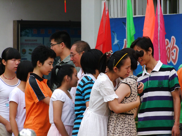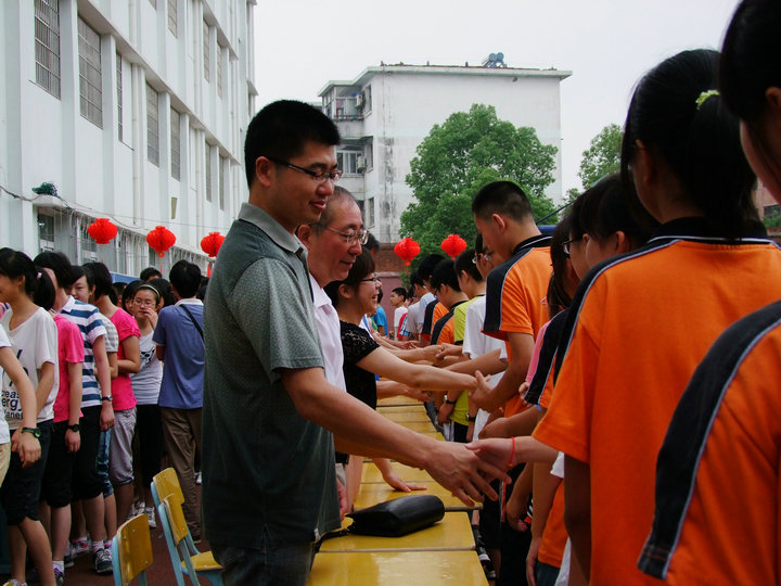 最后,在《友誼地久天長(zhǎng)》的背景音樂中,全體同學(xué)依次走上臺(tái)與老師們一一握手言別。在握手時(shí),在擁抱中,在音樂聲里,很多人都流下了眼淚,就連老天這時(shí)也灑下了幾滴小雨,仿佛也為這場(chǎng)景感動(dòng)落淚。