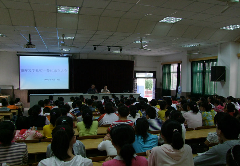 2012年9月19日早讀,我校“獨秀”文學社初一年級分社成立大會在報告廳舉行。此次會議由周興斌老師主持,德育部主任蘆丹出席了會議,他們和來自初一年級的新社員歡聚一堂,共同見證了“獨秀”文學社初一年級分社的成立。 此次大會使新社員們了解到“獨秀”文學社發(fā)展的歷程、開展的活動以及取得的成績,也明確了自己的權利和義務。它標志著我校校園文化在群芳競艷的基礎上又上了一個新的臺階。“獨秀”文學社將成為他們展示才華的舞臺,生命旅途中的驛站,少年時代的百草園。