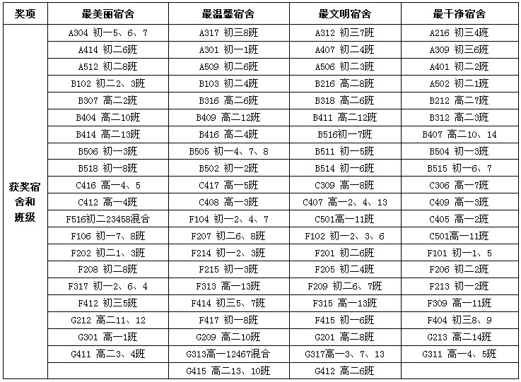 此次比賽主要面向初中部、高中部各個(gè)年級(jí),同學(xué)們積極參加,精心準(zhǔn)備,經(jīng)過學(xué)生自評(píng)和評(píng)委的現(xiàn)場評(píng)比,共有80個(gè)宿舍分別榮獲“最干凈宿舍”、“最美麗宿舍”、“最溫馨宿舍”和“最文明宿舍”等榮譽(yù)稱號(hào)。