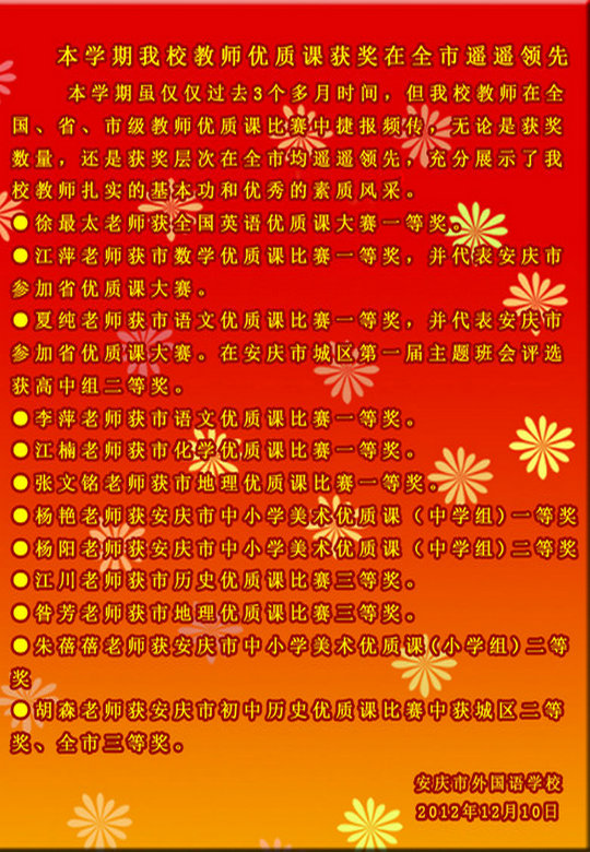 本學(xué)期我校教師優(yōu)質(zhì)課獲獎(jiǎng)在全市遙遙領(lǐng)先