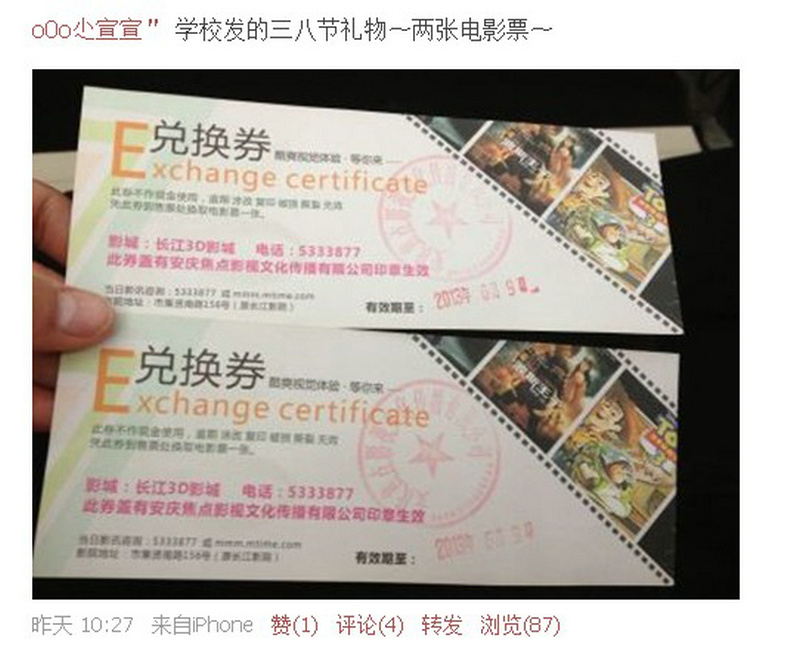 一年一度的國際“三八”婦女節(jié)又將來臨。宣美麗老師在自己的微博上幸福地曬出了一張照片,照片上顯示的的是兩張安慶長江影視城的3D電影票,這是怎么回事?