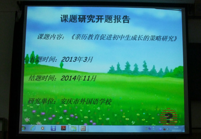 安慶市外國語學校關于《親歷教育促進初中生成長的策略研究》子課題開題報告于2013年3月12日在校會議室舉行,會議由課題主持人陳培峰老師主持,校長張燕斌、德育部主任蘆丹、課題組成員梁曉燕、周米、任艷等老師列席會議。