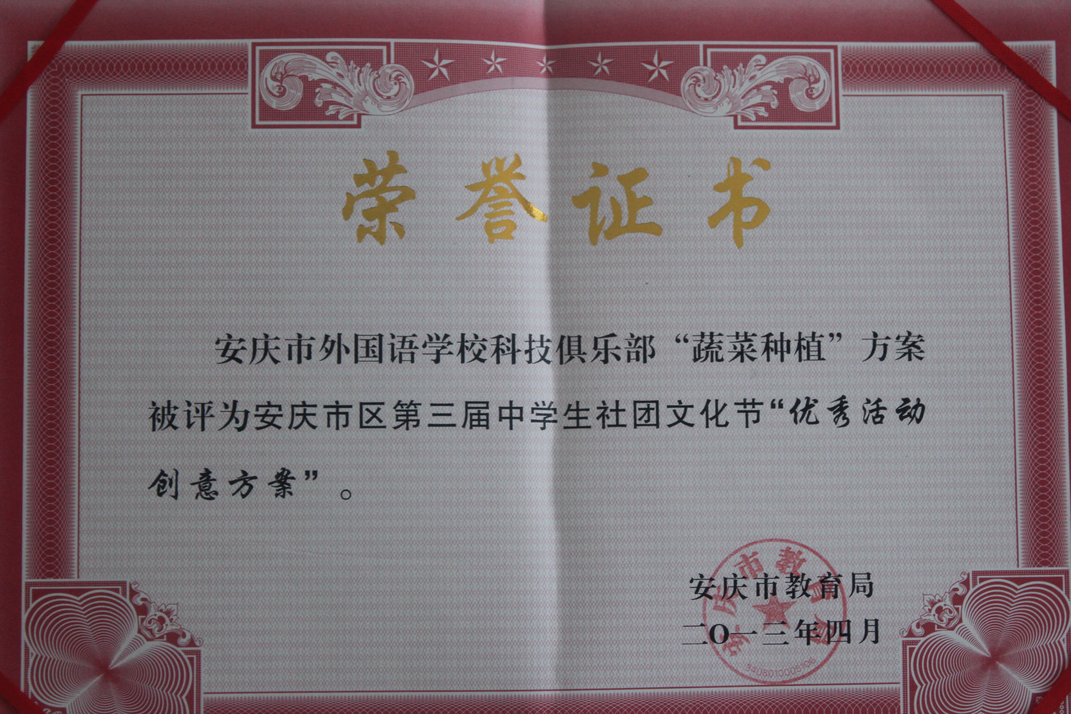 我?!笆卟朔N植”榮獲安慶市區(qū)第三屆中學(xué)生社團(tuán)文化節(jié)優(yōu)秀活動(dòng)創(chuàng)意方案