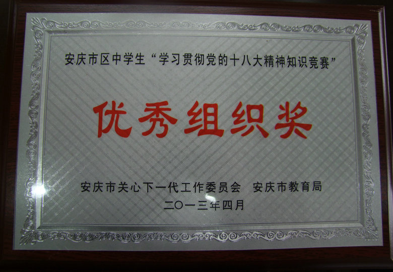 2013年5月18日上午10:30,在市教育局十樓會議室舉行了安慶市區(qū)中學(xué)生“學(xué)習(xí)貫徹黨的十八大精神知識競賽”活動頒獎儀式。安慶市外國語學(xué)校在此項活動中榮獲優(yōu)秀組織獎;同時,該競賽活動評出優(yōu)秀獎237名,鼓勵獎235名。各校組織30人參賽,安外西區(qū)30名參賽選手均獲得優(yōu)秀獎,其中初二(3)班汪玉瑞、初二(5)班黃凱、初二(9)班徐镕杰、初二(10)班汪佳藝榮獲優(yōu)秀獎前四名。