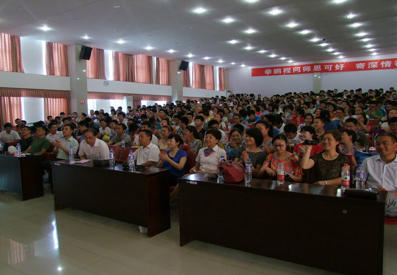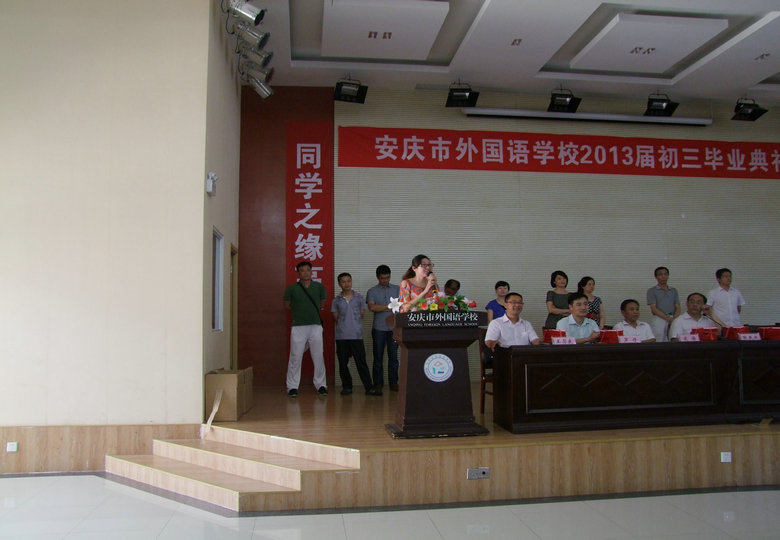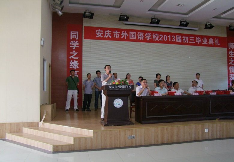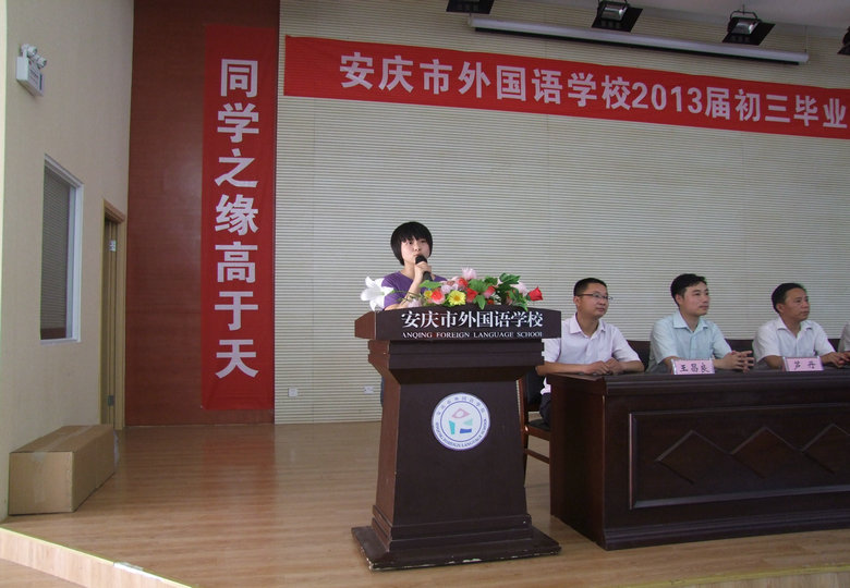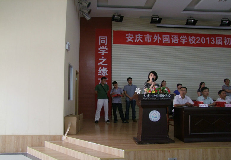 會場設在安慶市外國語學校東校區(qū)報告廳,西區(qū)所有初三班主任和任課老師、初三年級九個班的同學們齊聚一堂,黃文莉校長、張燕斌副校長、陳一平副校長、教學部凌謙主任、德育部蘆丹主任和人事部孫藝軍主任也出席了典禮。