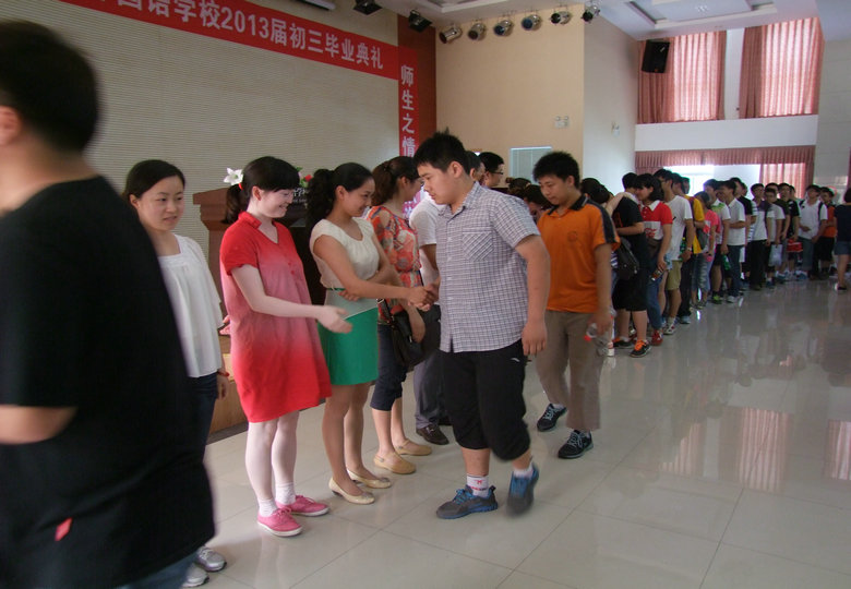 典禮在《友誼地久天長.》的歌聲中步入尾聲,老師和同學們握手惜別,整個會場彌漫著淡淡的憂傷和濃濃的幸福。