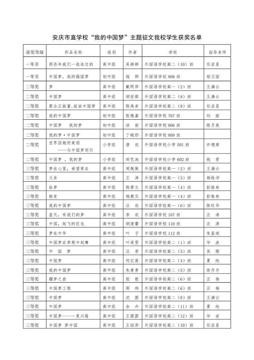 安慶市直學?!拔业闹袊鴫簟敝黝}征文我校學生獲獎名單