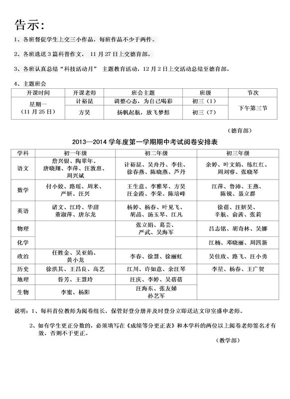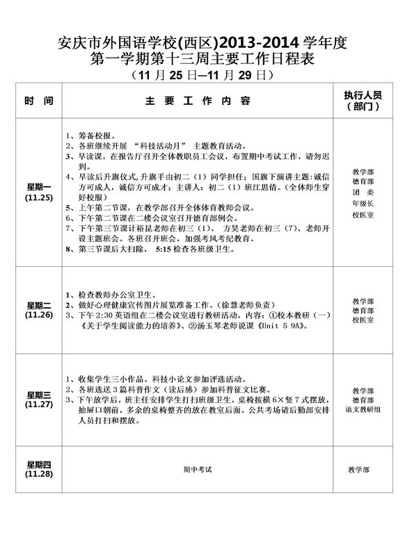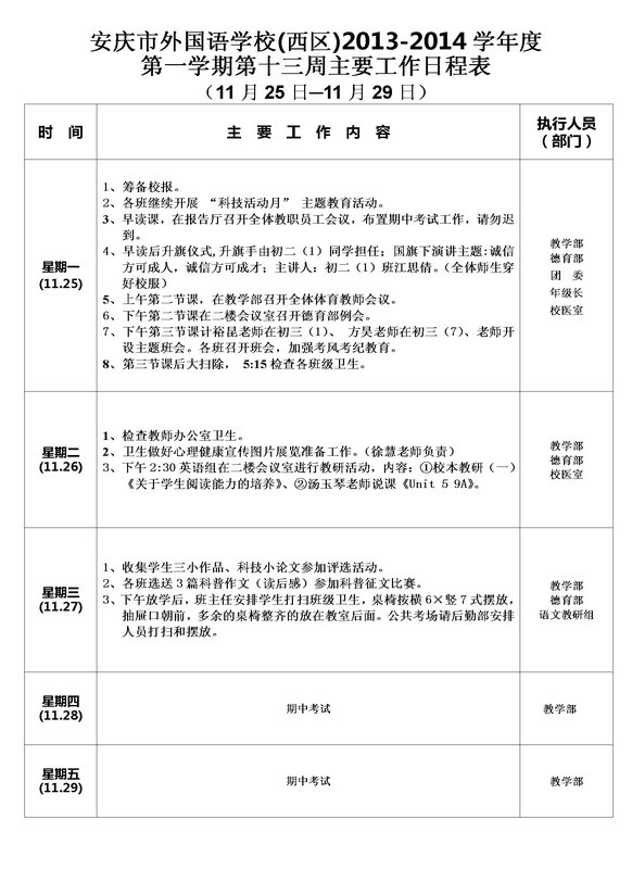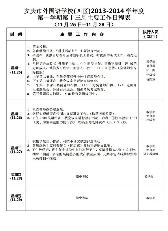 第十三周主要工作日程表
