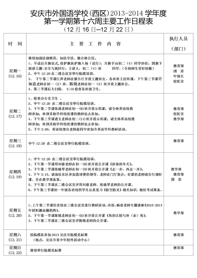 第十六周主要工作日程表