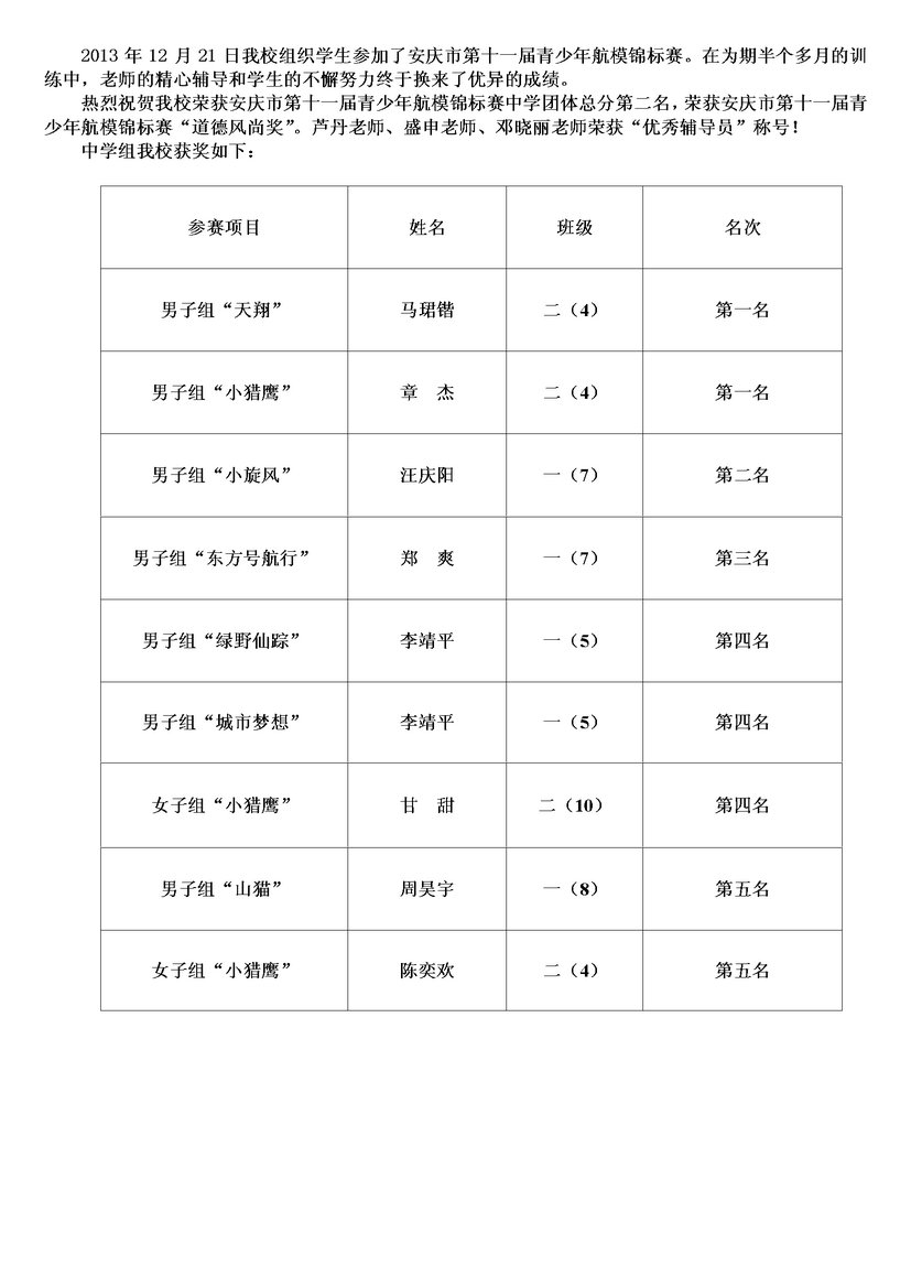 安外參加第十一屆青少年航模錦標(biāo)賽獲獎(jiǎng)喜訊