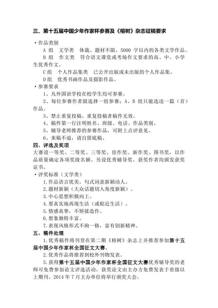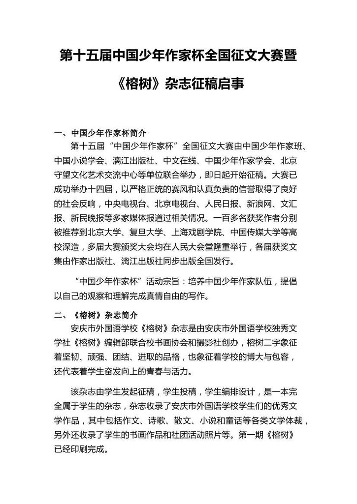 第十五屆中國少年作家杯全國征文大賽暨《榕樹》雜志征稿啟事
