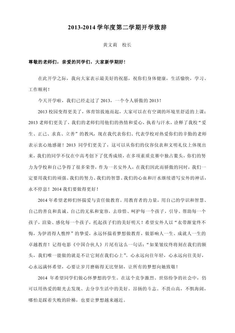 黃校長(zhǎng)2013-2014學(xué)年度第二學(xué)期開學(xué)致辭