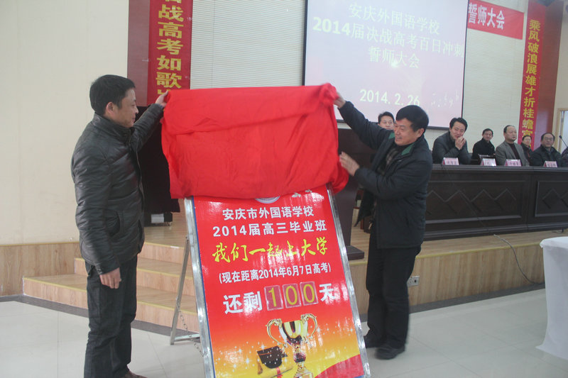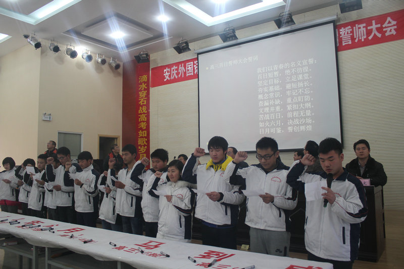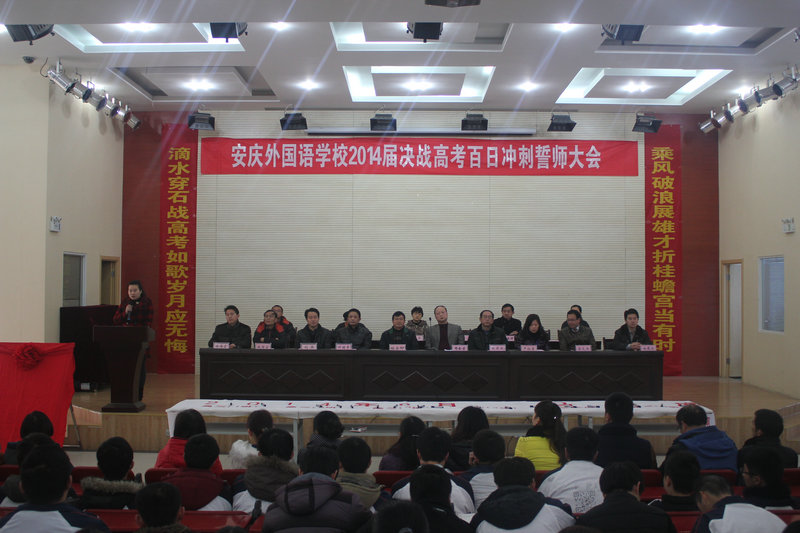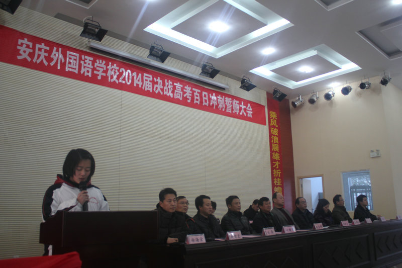 主席臺懸掛“安慶外國語學(xué)校2014屆決戰(zhàn)高考百日沖刺誓師大會”會標(biāo),主席臺兩側(cè)是對聯(lián)“滴水穿石戰(zhàn)高考如歌歲月應(yīng)無悔,乘風(fēng)破浪展雄才折桂蟾宮當(dāng)有時”。報告廳后墻上高掛著橫幅“十年礪劍百日策馬闖雄關(guān),一朝試鋒六月?lián)P眉傳佳音”。