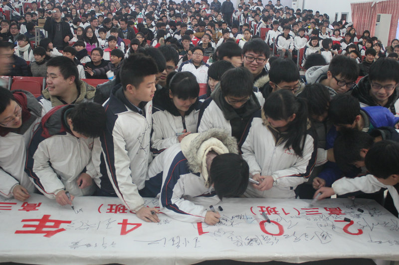 學(xué)校領(lǐng)導(dǎo)、高三老師、全體高三學(xué)子在勵志橫幅上簽下了他們的誓言和祝福。簽名橫幅將保存在學(xué)校檔案室,以見證我們今日的誓言。