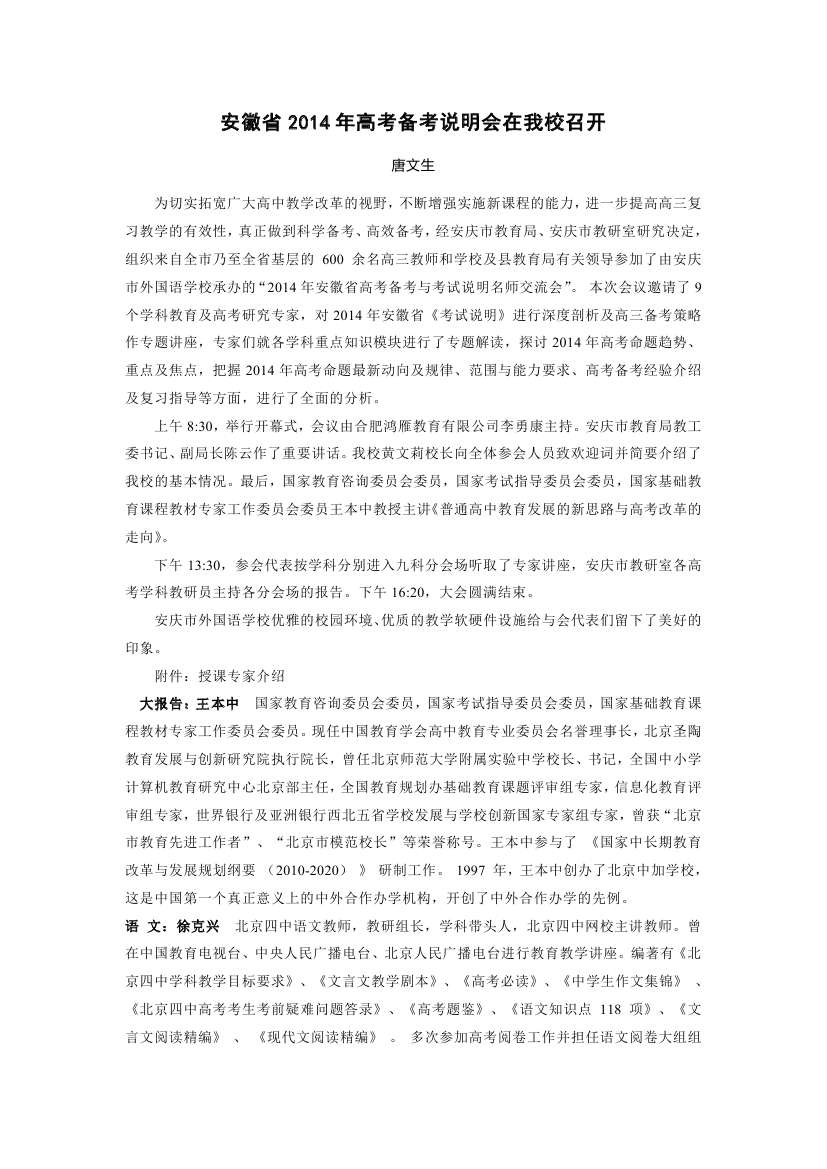安徽省2014年高考備考說(shuō)明會(huì)在我校召開(kāi)