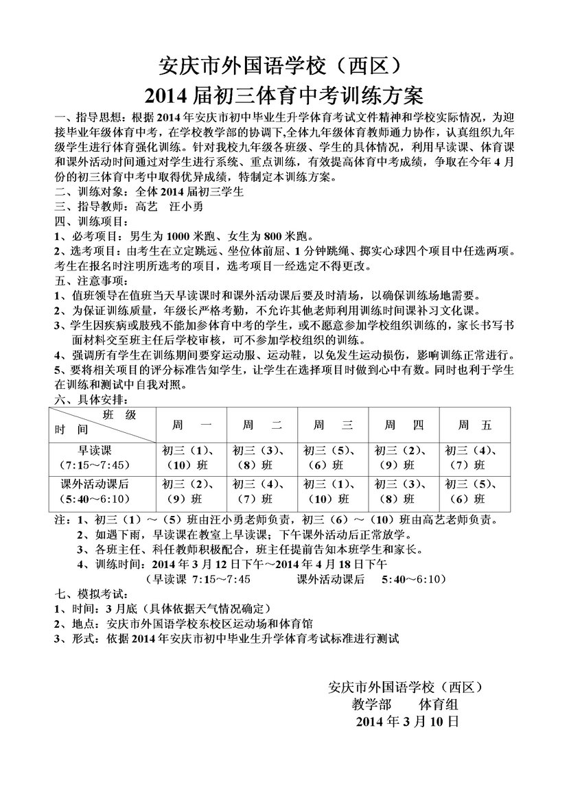 安慶市外國語學(xué)校(西區(qū))2014屆初三體育中考訓(xùn)練方案