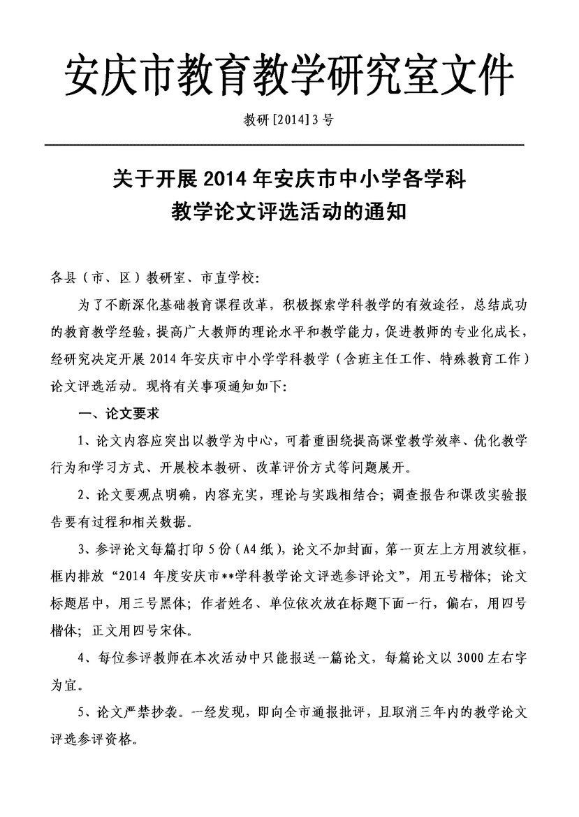 關(guān)于開展2014年安慶市中小學(xué)各學(xué)科教學(xué)論文評選活動(dòng)的通知