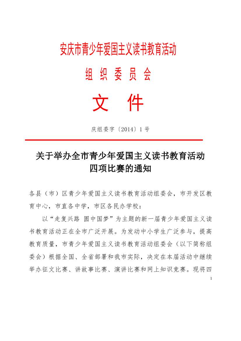 關(guān)于舉辦全市青少年愛(ài)國(guó)主義讀書(shū)教育活動(dòng)四項(xiàng)比賽的通知