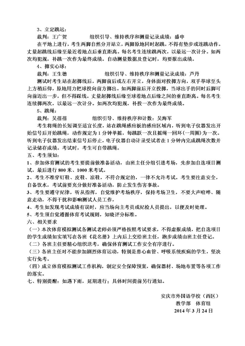 2014年安慶市外國(guó)語(yǔ)學(xué)校(西區(qū))初三體育中考模擬測(cè)試方案