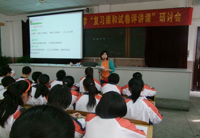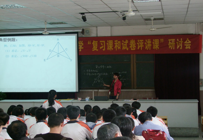 下午2:00,李榮老師的復(fù)習(xí)課準(zhǔn)時(shí)開始,這堂課的內(nèi)容是初三《全等三角形復(fù)習(xí)》。李榮老師緊緊圍繞考綱,由淺入深地引導(dǎo)學(xué)生展開,這節(jié)課既涵蓋整章知識點(diǎn)又能適時(shí)加強(qiáng)知識間的聯(lián)系,鍛煉了學(xué)生的思維能力,拓展了學(xué)生的知識面,學(xué)生參與度高、達(dá)標(biāo)率高。第二節(jié)課周米老師上的是初二年級的月考試卷分析課,這節(jié)課周米老師設(shè)計(jì)獨(dú)到,打破逐題分析的常規(guī),重點(diǎn)放在易錯(cuò)題分析和數(shù)學(xué)思想滲透上。一堂試卷分析課既讓學(xué)生反思了錯(cuò)誤原因,又讓學(xué)生對所學(xué)知識產(chǎn)生了一次再認(rèn)識、再提高的過程,課堂設(shè)計(jì)好、收效大。第三節(jié)課點(diǎn)評時(shí),各專家給出了中肯的意見和建議,并給予兩節(jié)課相當(dāng)多的肯定。評價(jià)前陳一平副校長代表學(xué)校致了歡迎辭,數(shù)學(xué)組長陳培峰對數(shù)學(xué)組的教研工作做了簡單的介紹。
