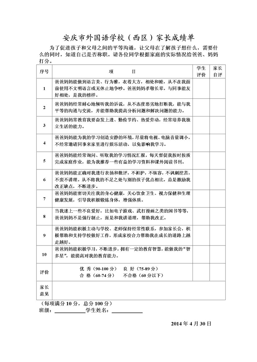 安慶市外國(guó)語(yǔ)學(xué)校(西區(qū))開展學(xué)生給家長(zhǎng)行為打分活動(dòng)