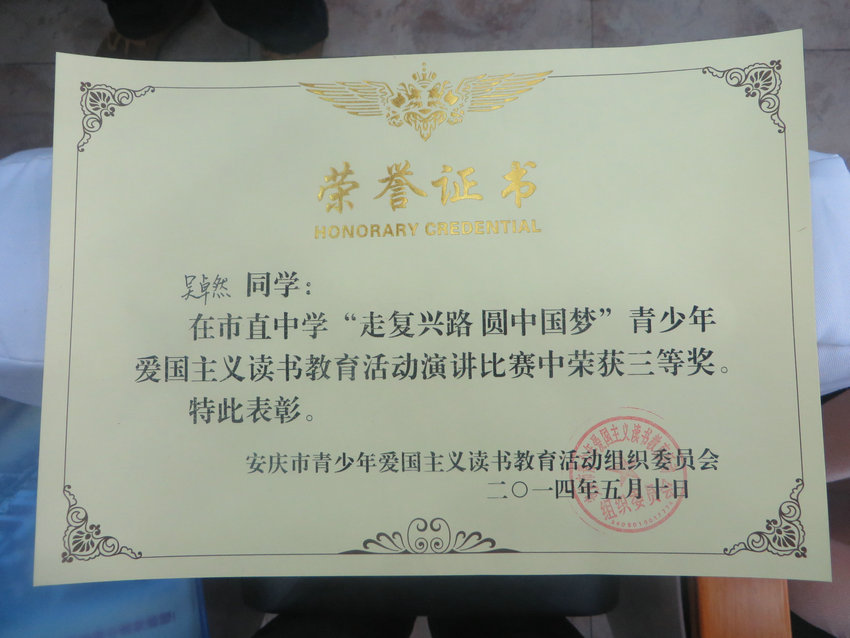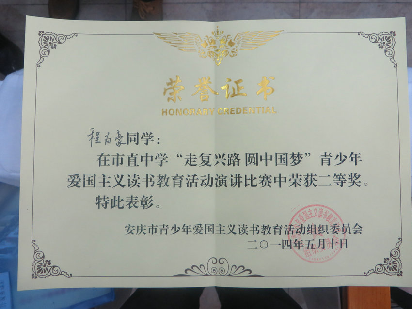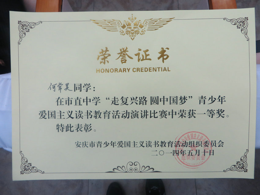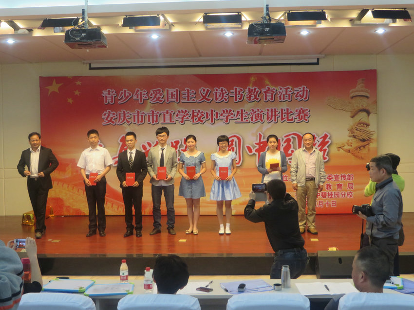 5月10日上午,安慶市直中學(xué)生愛國主義讀書演講比賽在安慶二中碧桂園分校隆重舉行,來自19所市直中學(xué)的41名選手參加了激烈的角逐。我校東西兩區(qū)派出的4位學(xué)生不負(fù)眾望,喜獲佳績,鄭星紀(jì)同學(xué)榮獲第一名,何常昊同學(xué)榮獲第五名,兩位同學(xué)雙雙榮獲一等獎;程為豪和吳卓然同學(xué)也分別獲得二、三等獎。在此,向以上四位獲獎同學(xué)表示熱烈祝賀,也對他們?yōu)閷W(xué)校爭得榮譽表示感謝!同時,也對四位同學(xué)的指導(dǎo)老師表示祝賀和感謝!