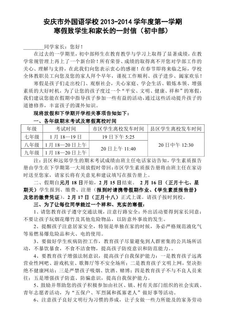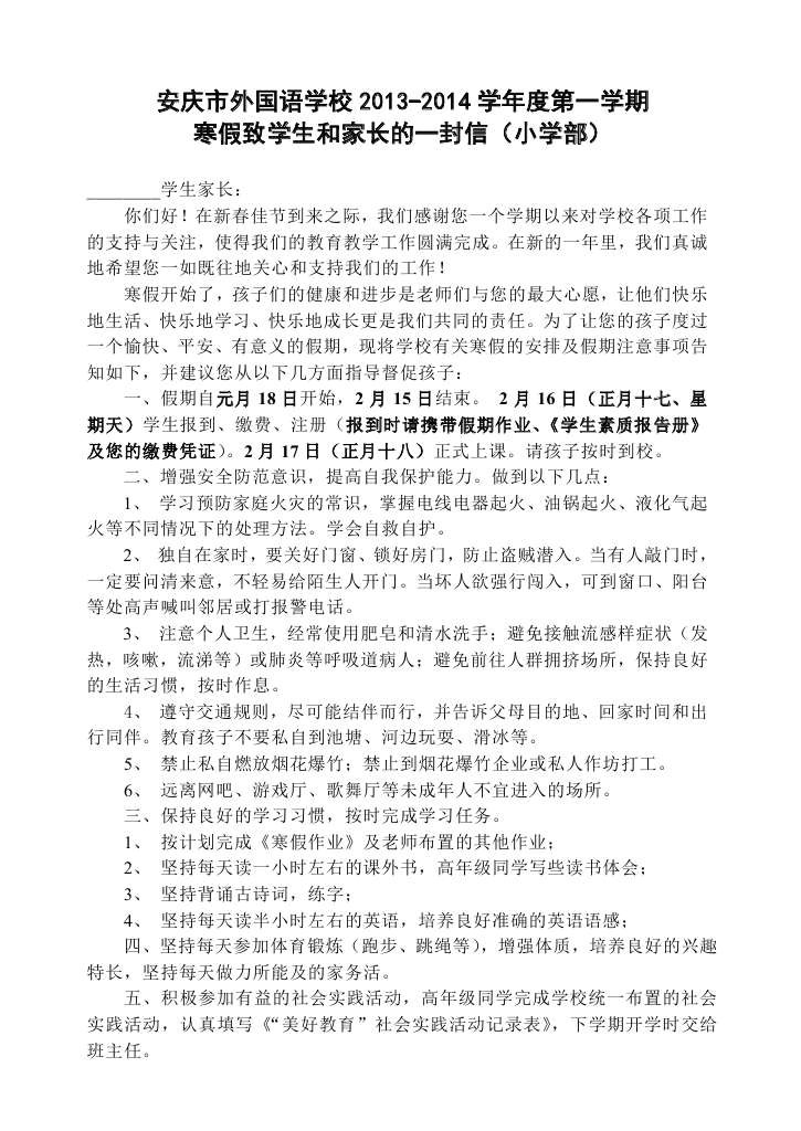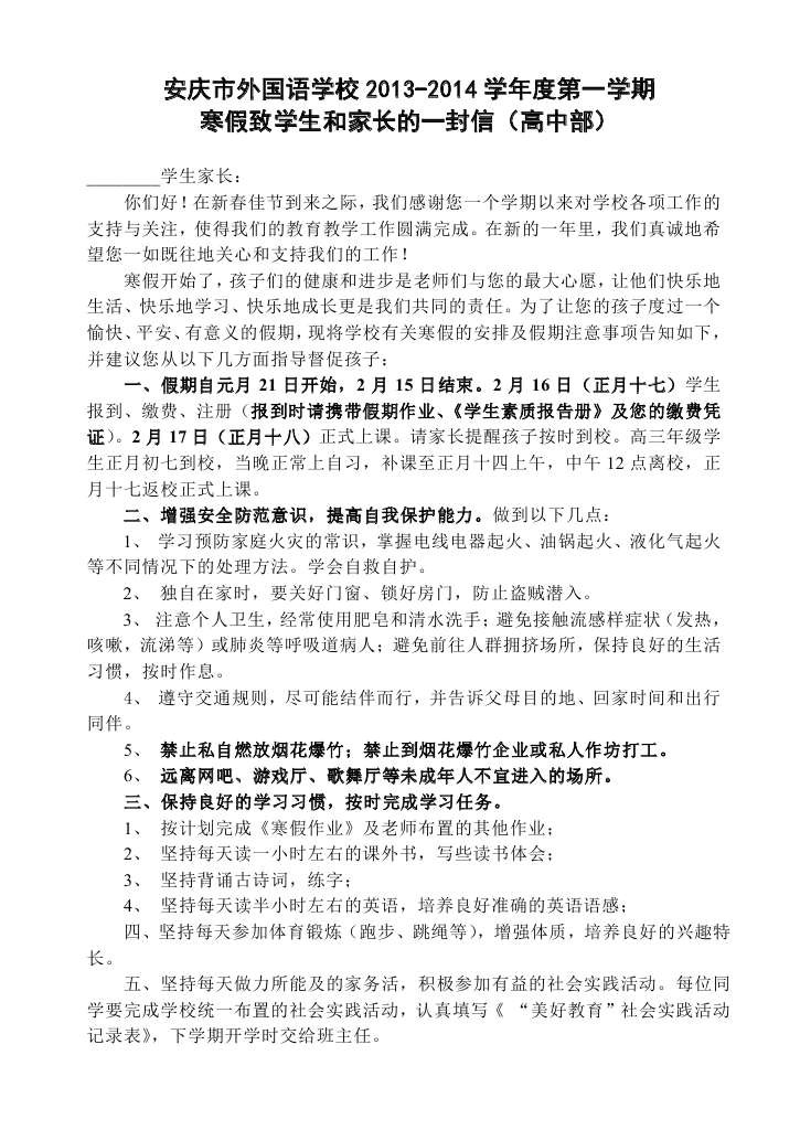2013年寒假致學(xué)生家長(zhǎng)的一封信