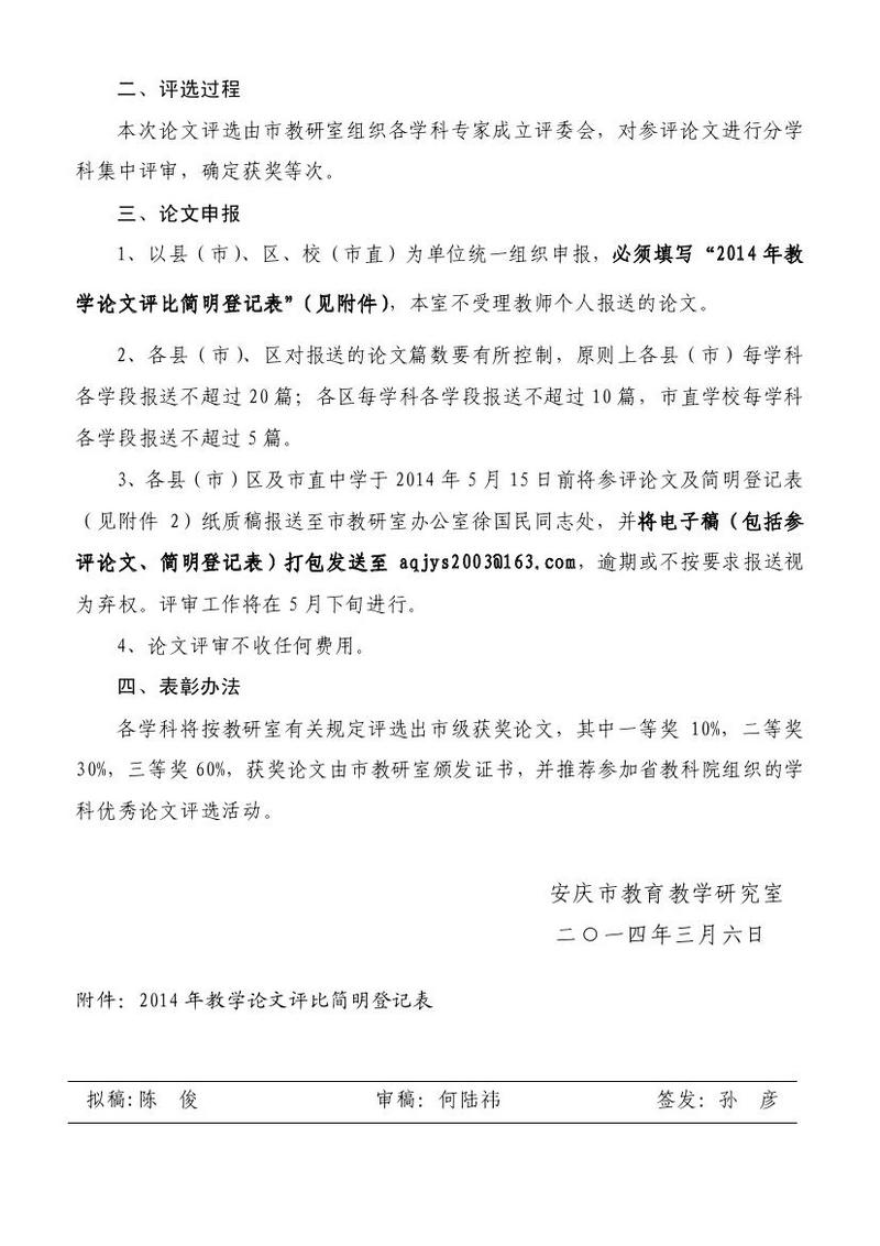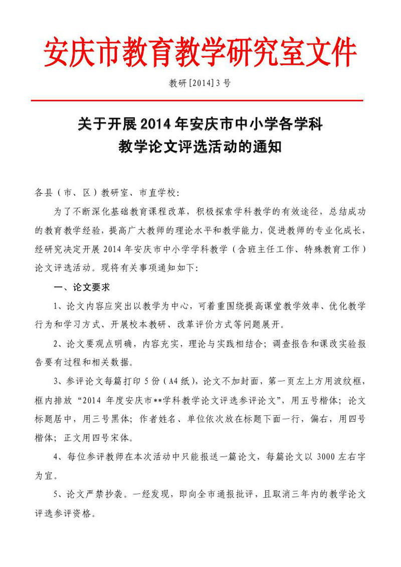關(guān)于開展2014年安慶市中小學(xué)各學(xué)科教學(xué)論文評選活動(dòng)的通知